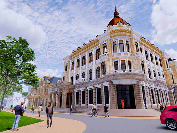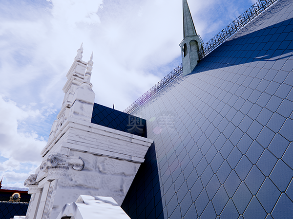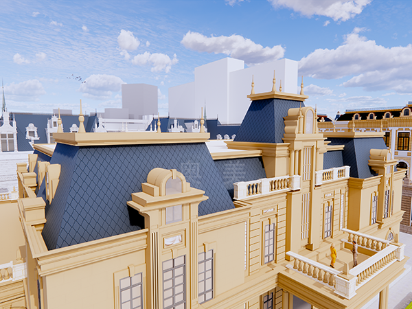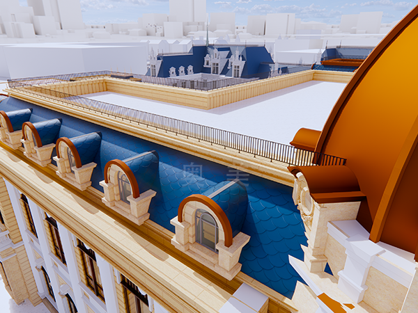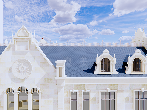 此為中東歐商務(wù)中心項(xiàng)目,此屋面系統(tǒng)采用的是新型建筑材料金屬?gòu)?fù)合瓦鋪設(shè)而成。