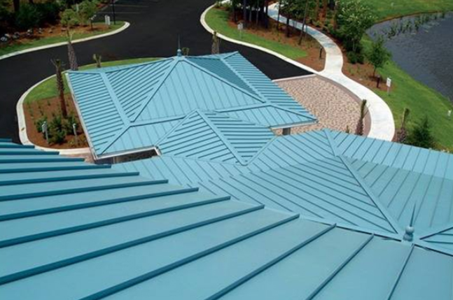 直立鎖邊金屬防水屋面系統(tǒng)是通過帶肋的金屬板互相咬合,從而達到防水目的的一種新型的、先進的屋面系統(tǒng)。金屬屋面板可以是鋁鎂錳板,也可以是鍍鋁鋅鋼板。其主要結(jié)構(gòu)形式是:首先將T型固定座(一般為鋁合金材質(zhì))固定在主結(jié)構(gòu)檁條上,再將屋面防水板扣在固定座的梅花頭上,最后用電動鎖邊機將屋面板的搭接扣邊咬合在一起。直立鎖邊系統(tǒng)屬新興的防水技術(shù),具有固定方式先進、溫度變形自由伸縮、抗風壓性能好、耐腐蝕性好及靈活的現(xiàn)場生產(chǎn)方式等特點,保證了其致密防水的功能;并且由于板肋直立,排水截面比普通板大,更能保證屋面板在橫向傾斜情況下的防水性能,因而是一種先進的屋面防水系統(tǒng),防水性能優(yōu)異。