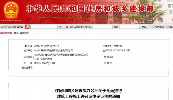 住房和城鄉(xiāng)建設(shè)部官網(wǎng)6月24日消息,為深化“放管服”改革,提升建筑業(yè)政務(wù)服務(wù)質(zhì)量,按照國務(wù)院辦公廳電子政務(wù)辦公室要求,住房和城鄉(xiāng)建設(shè)部決定自2021年1月1日起,在全國范圍內(nèi)推廣應(yīng)用建筑工程施工許可證電子證照。